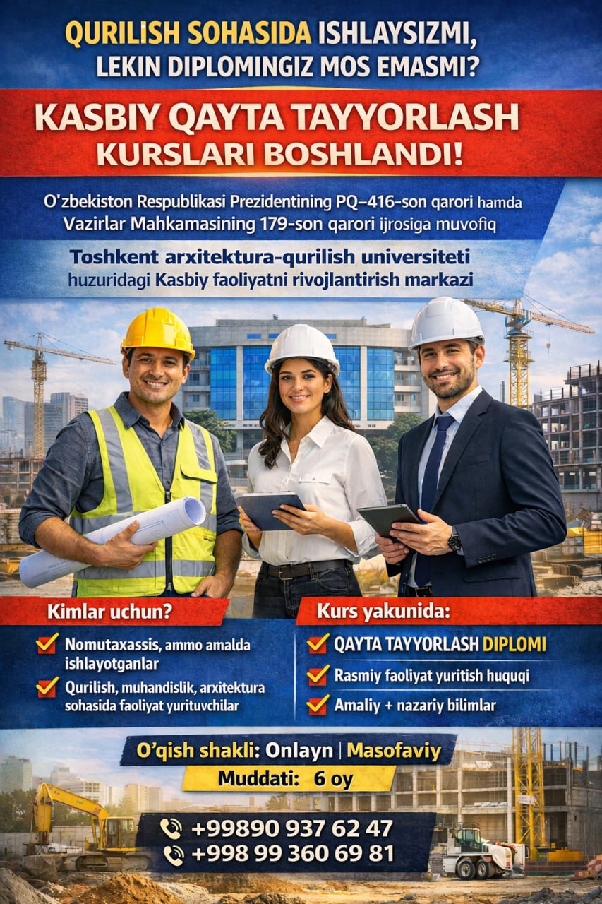 6 oylik (576 soat) kasbiy qayta tayyorlash kursi (Arxitektura va qurilish sohasidagi turdosh yo‘nalishlar uchun)